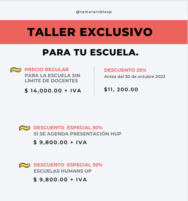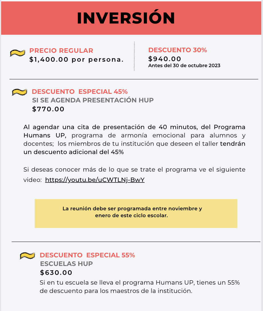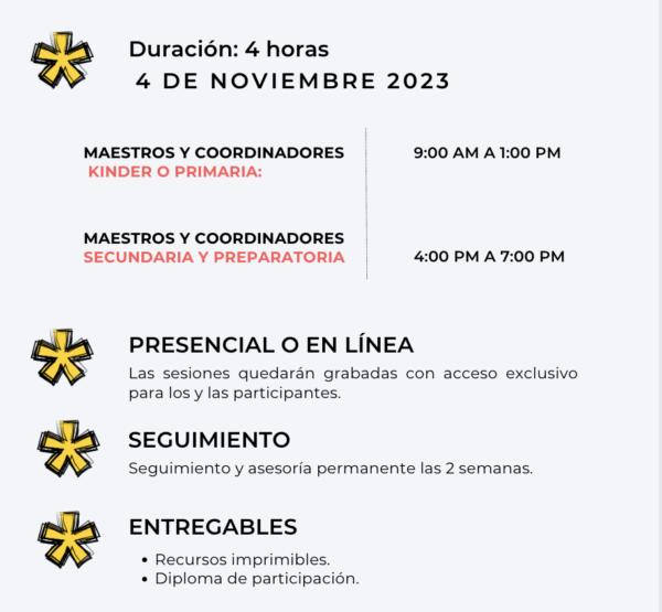 Es un taller práctico y dinámico en el que aprenderás estrategias, metodología y dinámicas que puedas aplicar con facilidad en tu salón de clases que ayuden a mejorar la conducta, el manejo de emociones y que el ambiente entre los alumnos sea más armónico.